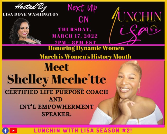 Women’s History Month Part II Lunchin’ with Lisa is celebrating some amazing women all month Long for Women’s History Month! Make sure you Tune In and catch these amazing women and hear all about their journey. Be Inspired and Motivated! We have an amazing guest, Shelley Meche’tte.