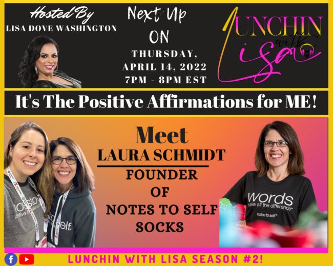 It’s The Possitive Affirmations It’s A Party on The Lunchin’ with Lisa Show Meet Laura Schmidt, founder of Notes To Self Socks.