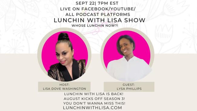 Lunchin With Lisa Feat. Lysa Phillips Tune into the Lunchin with Lisa Show with the Lysa Phillips. You can watch us on Facebook & Youtube, make sure you LIKE the Lunchin with Lisa Facebook Page or Subscribe to Lisa Dove Washington Channel so you can get the reminder and catch the fun. When: September 22,…
